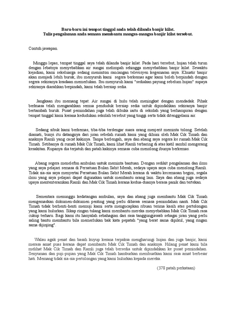Panjang jawapan kamu tidak kurang daripada 80 patah perkataan. Contoh karangan tentang banjir minimal 5 paragraf yaitu. Punca ini merupakan penyebab yang berasal dari alam itu sendiri.